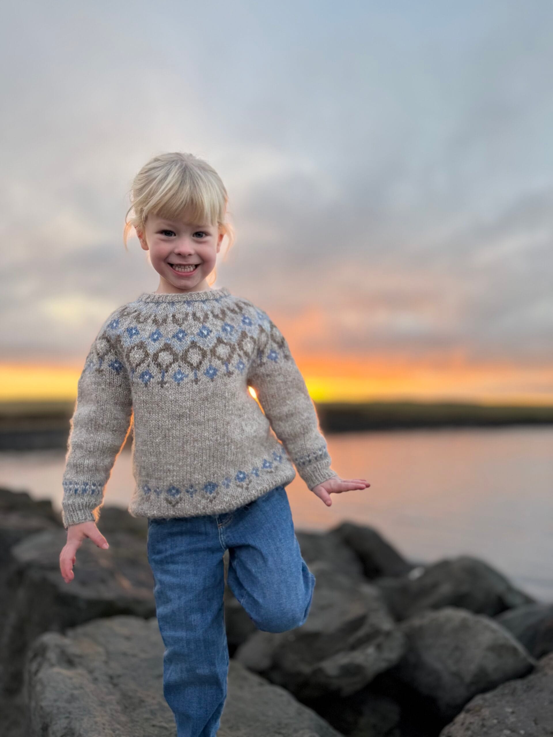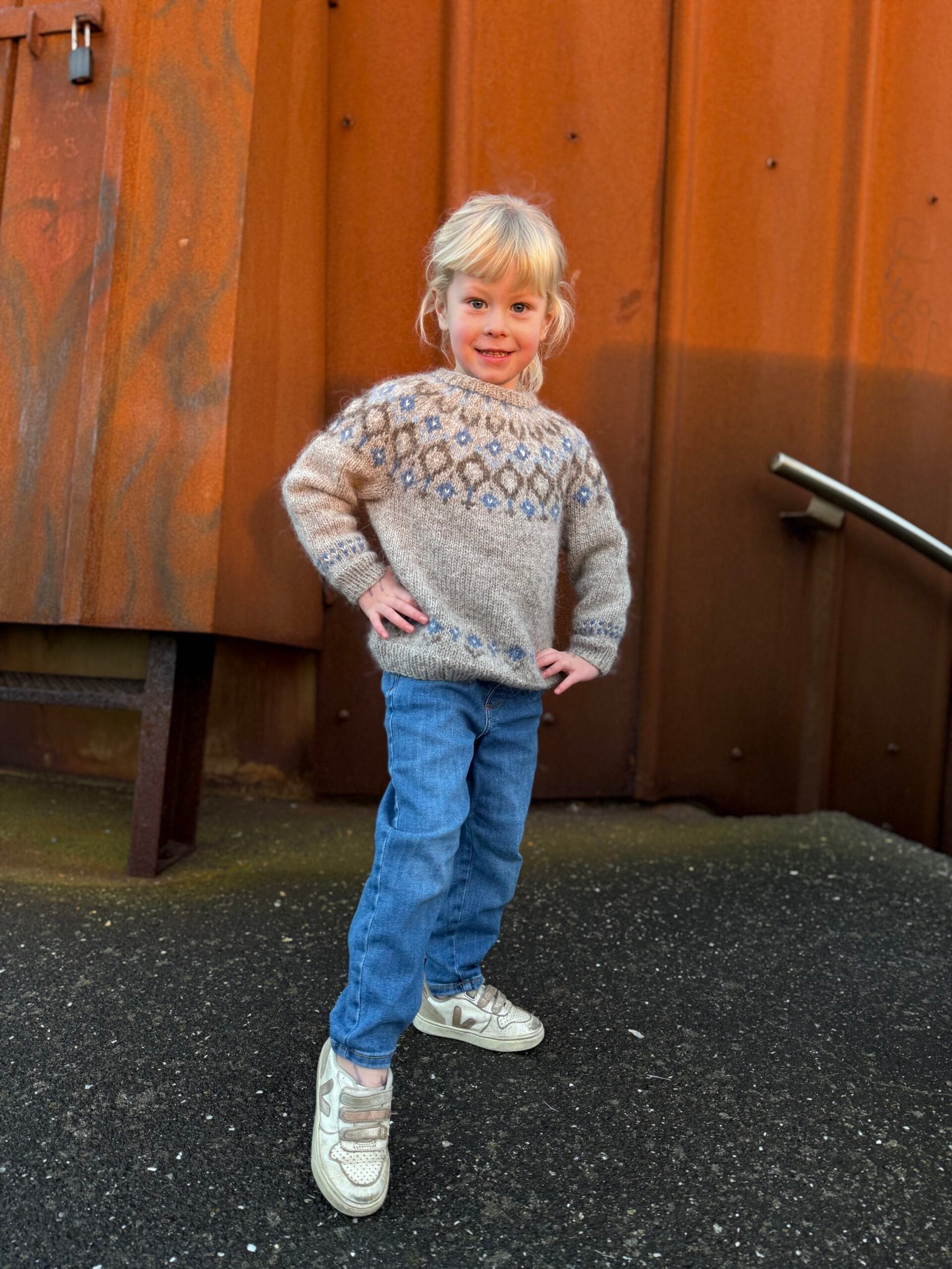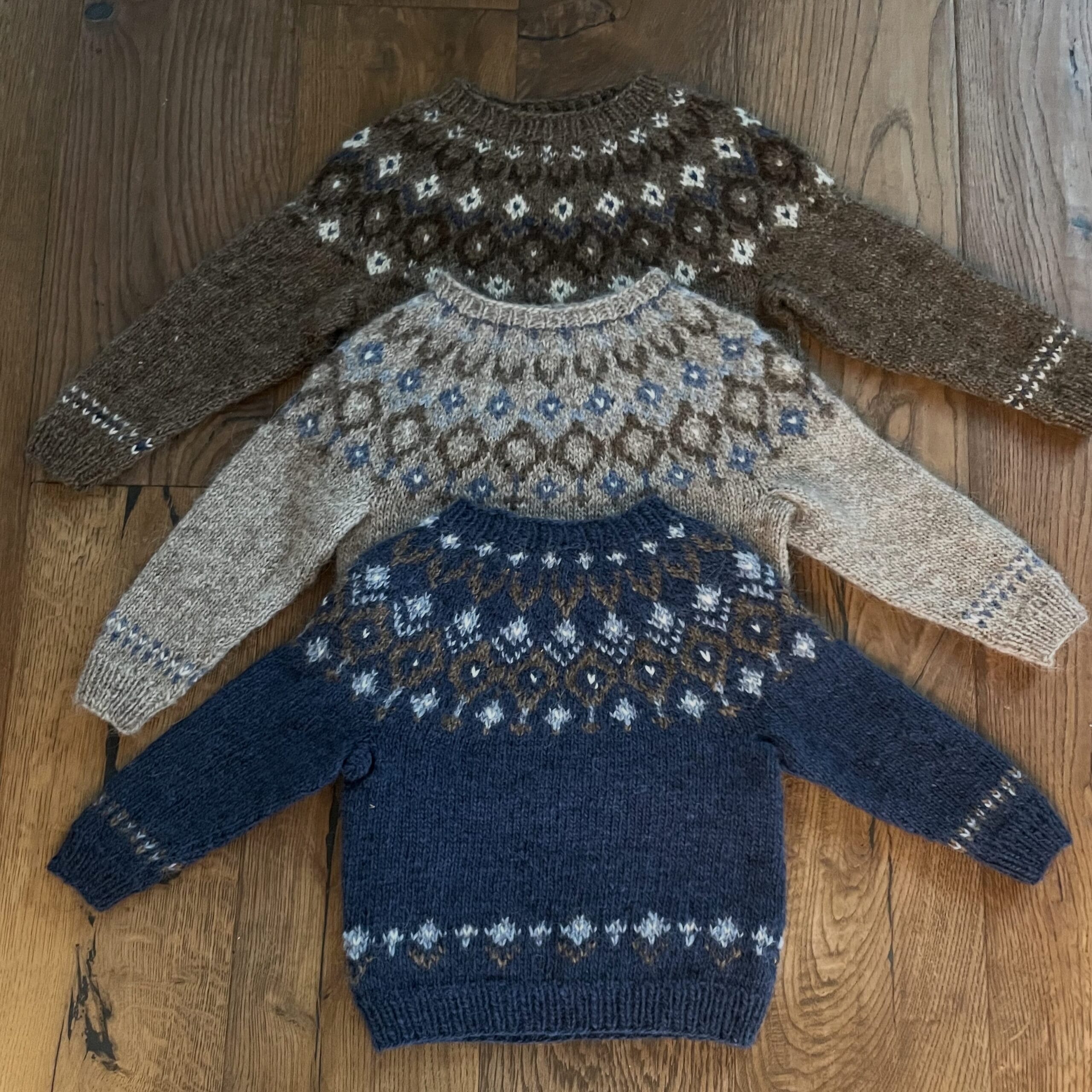 Peysan Einstök er prjónuð neðan frá og upp. Í brúnu og bláu peysunni eru 4 litir: 1 grunnlitur og 3 munsturlitir. Í dröppuðu peysunni eru litirnir 5, einn grunnlitur og 4 munsturlitir.